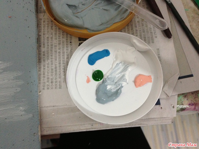 Небо сделали, теперь начинаем прорисовывать низ. Для нижнего фона нам нужны бежевая, горчичная(охра желтая), коричневая, зеленая краски. Не забывайте, что тоже надо приглушать базовым тоном(серо-голубой). Если надо, то красками проходимся и по салфетке.