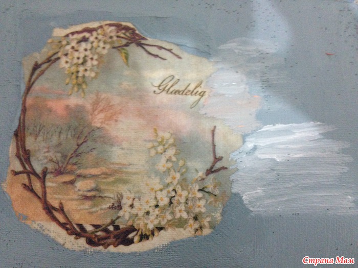 Рассматриваем внимательно картинку и начинаем прорисовывать небо, как бы продолжая нашу салфетку. Растушевываем с базовым тоном(в данном случае, серо-голубой).