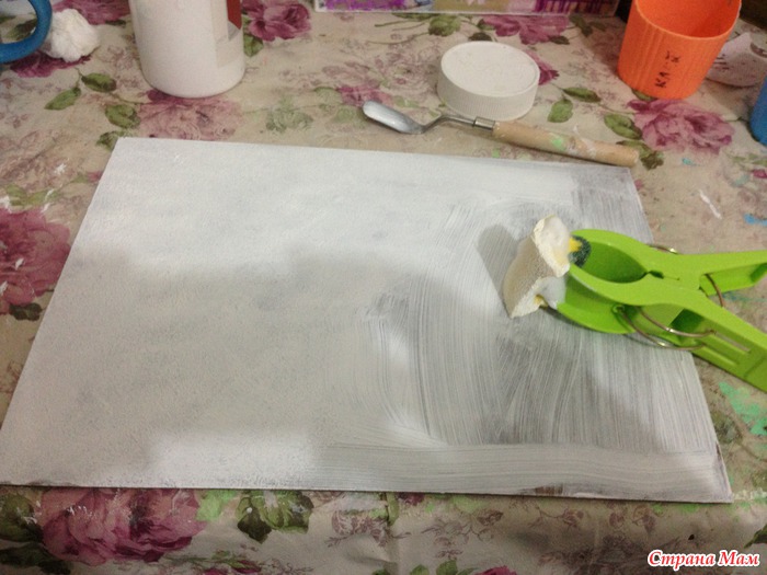 Делаем базовый фон. Губкой не чпокаем, а работаем как кистью. Все хорошенечко закрашиваем.