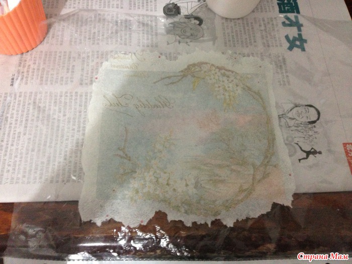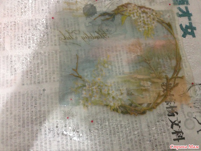 Из пулевизатора брызгаем на салфетку соленой водой. Салфетка должна плавать. Аккуратно расправляем складочки, пальцами выгоняем пузыри и сливаем ненужную воду. Переворачиваем файл и кладем на нашу заготовку.