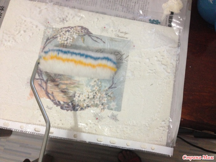 Прокатываем валиком от центра салфетки. Можно разглаживать тканью.