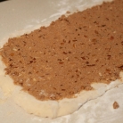 4. Раскатать тесто в прямоугольник размером 20Х30 см. Залить 2 столовые ложки топленого масла на тесто и смазать всю поверхность пальцами. Выложить начинку на тесто и равномерно распределить ее по всей поверхности, оставляя границу 1 см по внешнему краю. Прижать начинку к тесту.