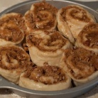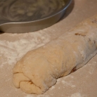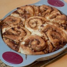 5. Начиная с длинной стороны теста, свернуть его рулетом и защипнуть швы. Выложить рулет швом вниз на рабочей поверхности. Разрезать на 8 кусков и поместить булочки в форму. Смазать оставшимися 2 столовыми ложками топленого сливочного масла. Выпекать в течение 20-23 минут, до золотисто-коричневого цвета.