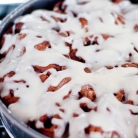 6. Чтобы сделать глазурь, взбить в миске сливочный сыр или масло и сахарную пудру. Добавить пахту и взбивать, пока смесь не станет однородной. Дать булочкам остыть в форме в течение 5 минут, затем выложить их на стойку и залить глазурью.