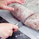 4. Свернуть тесто в рулет. Выложить рулет швом вниз на рабочую поверхность. Разрезать на 8 кусков.