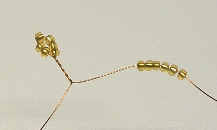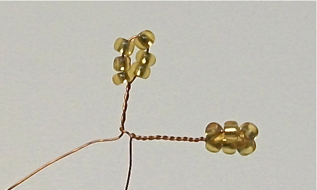 Далее набираем на один из концов проволоки ещё 6 бисеринок и размещаем их примерно в 1,5 см от конца первой скрутки.