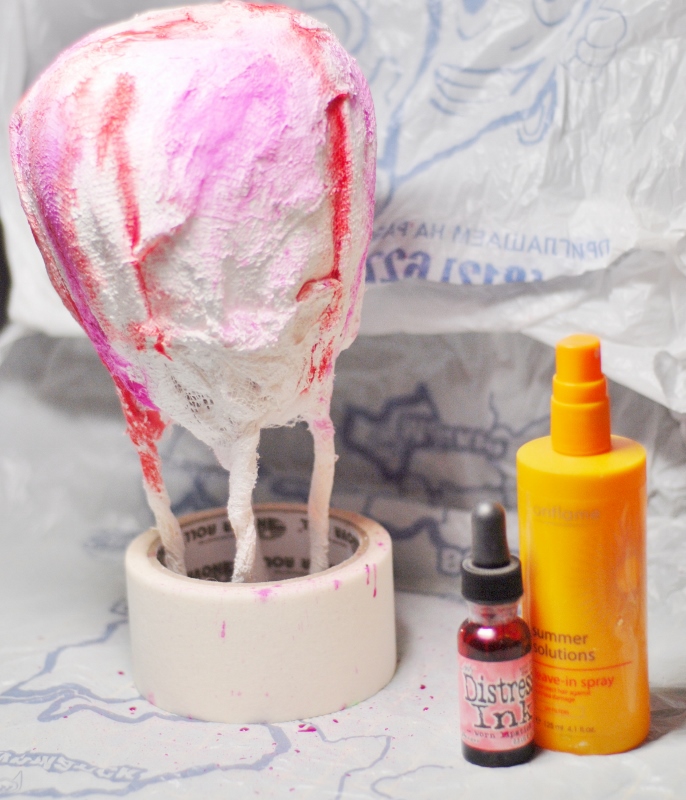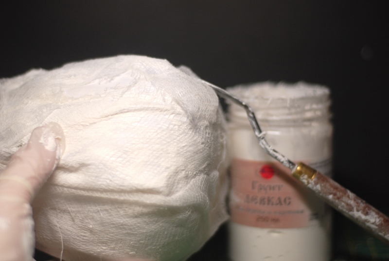 Взяла наш шар с тканью и обработала его весь акриловым грунтом в 2-4 мм слоем