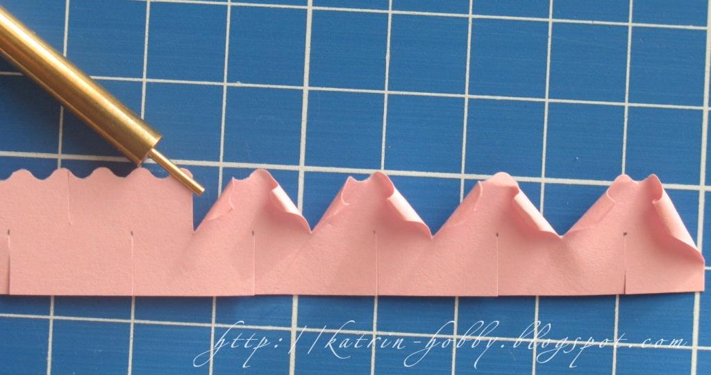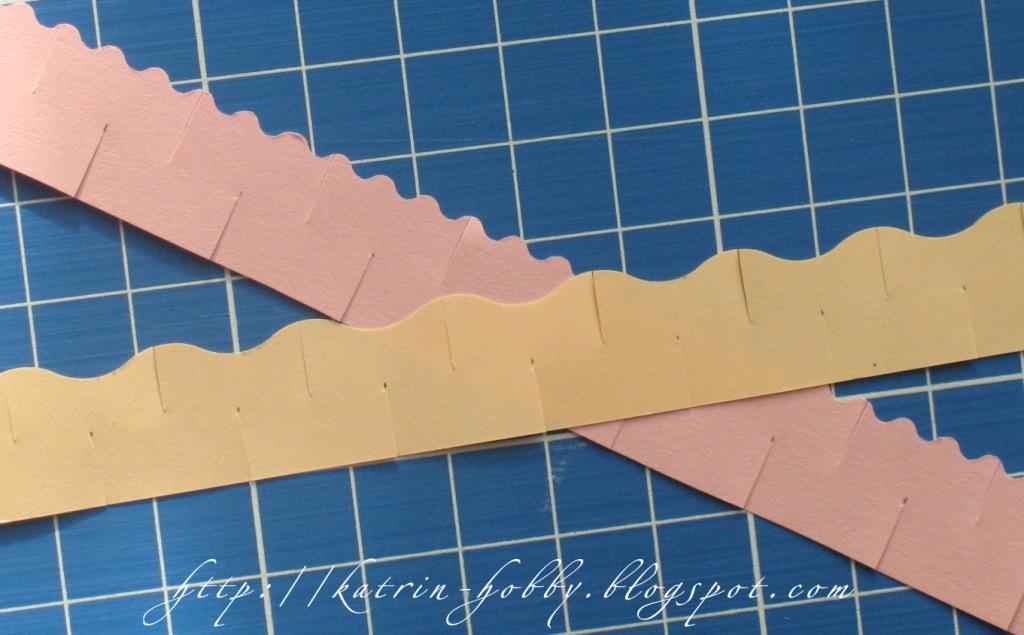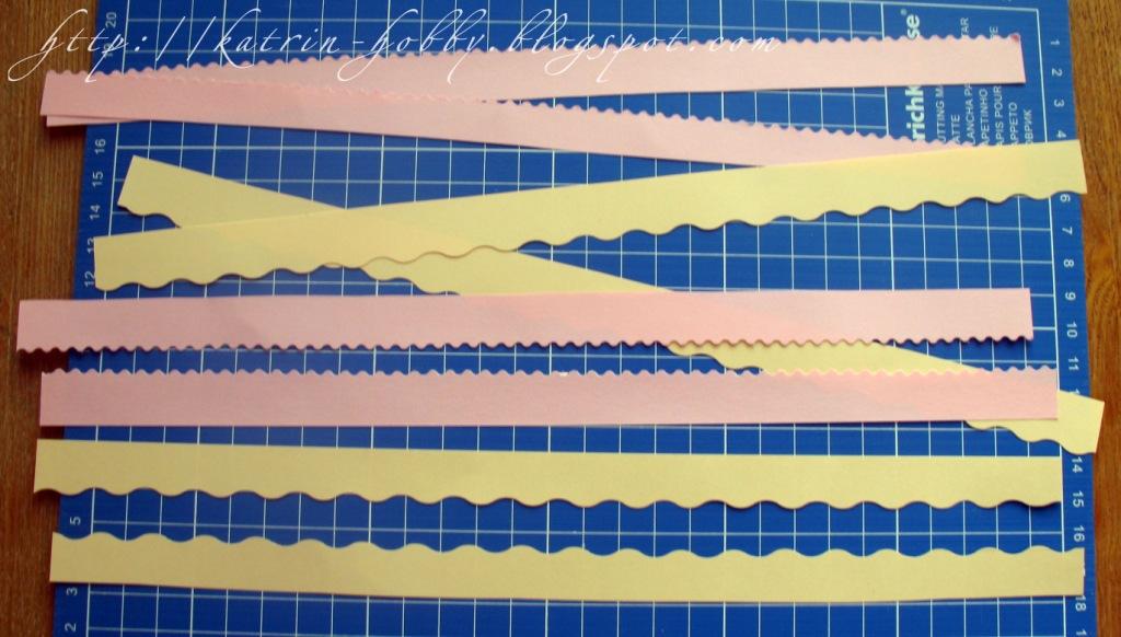 Затем нарезаем полосы с одной стороны обычными ножницами, с другой волнистыми. Где необходимо, стираем ластиком отметки от простого карандаша.