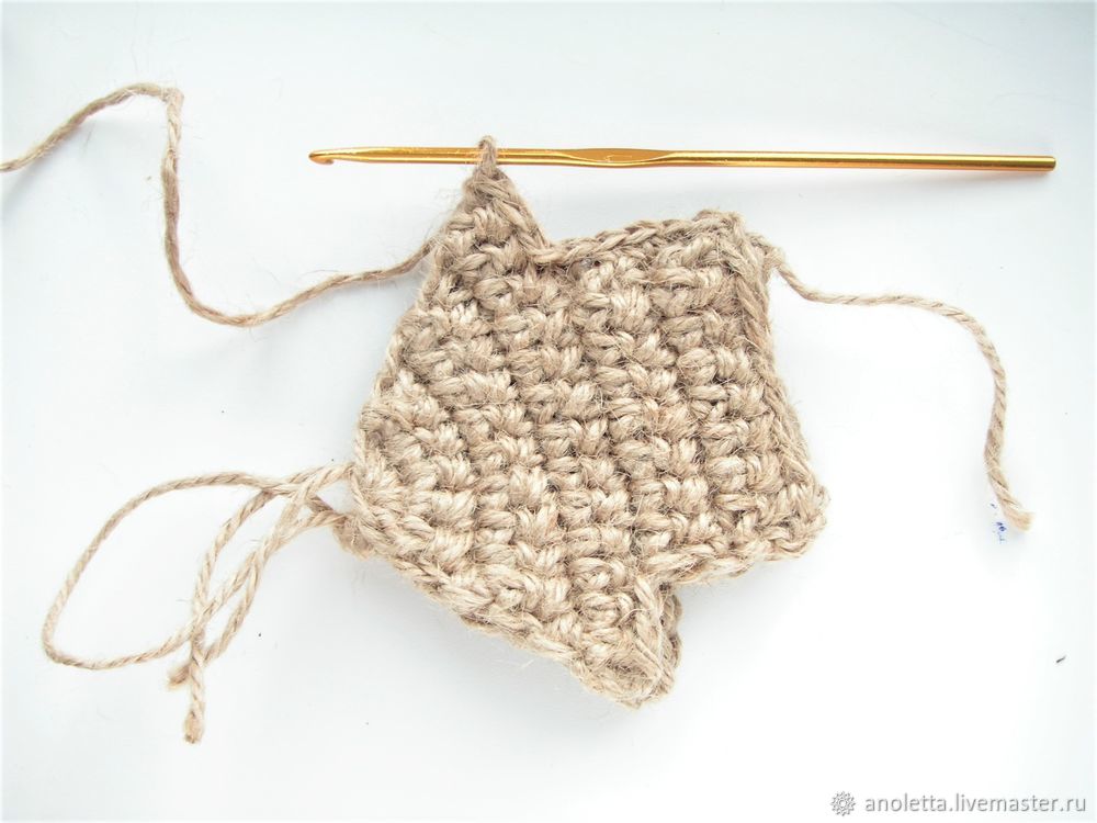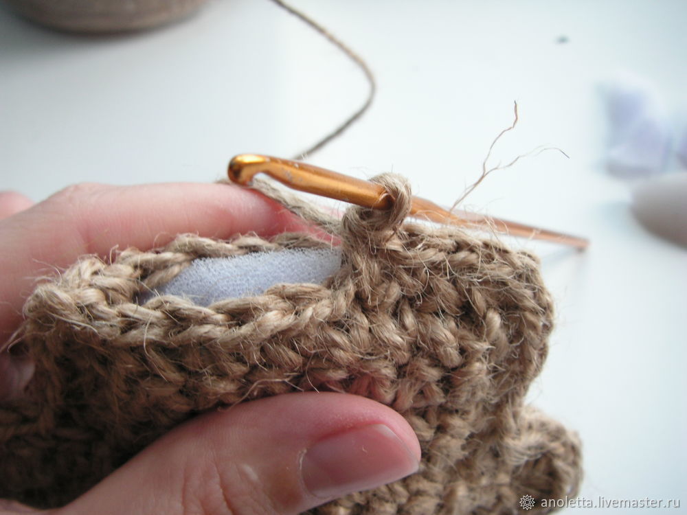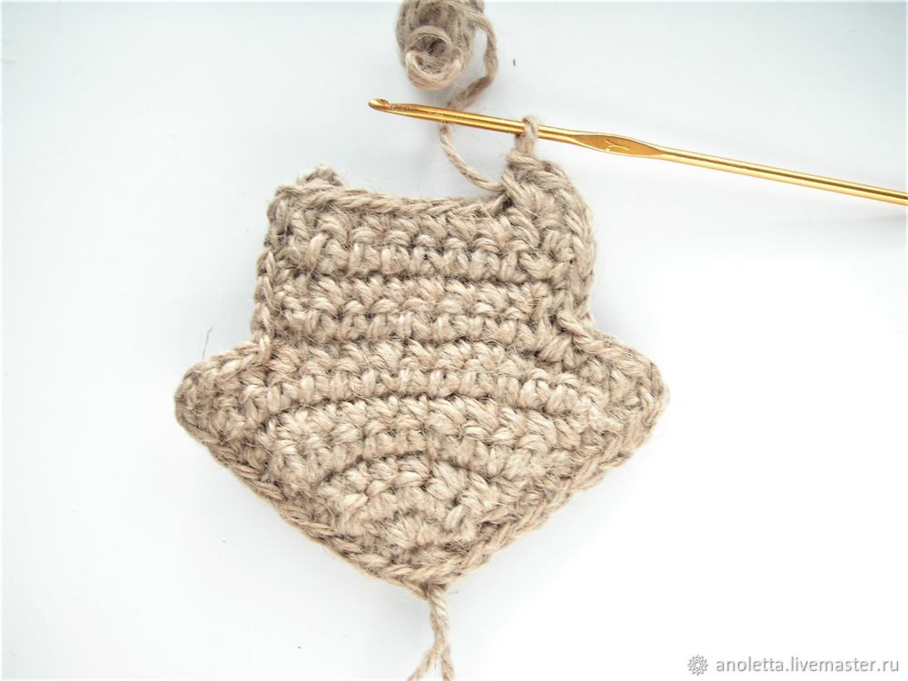 В конце вязания второй половины нить обрезать не нужно. Мы накладываем одну деталь на другую и обвязываем их стбн.