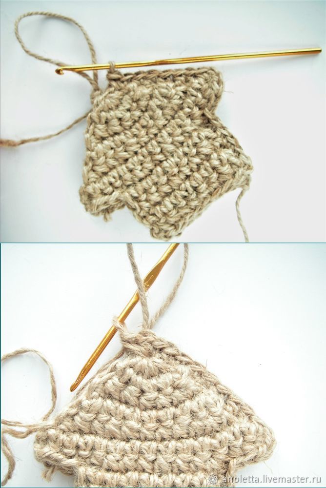 Вязание начинается с верхней части крыши. Я начинаю делать первую половинку домика с петельки, за которую игрушка будет вешаться на елку. Для этого из джута я формирую петлю и завязываю на ней узел, оставив при этом кончик не менее 5 см.