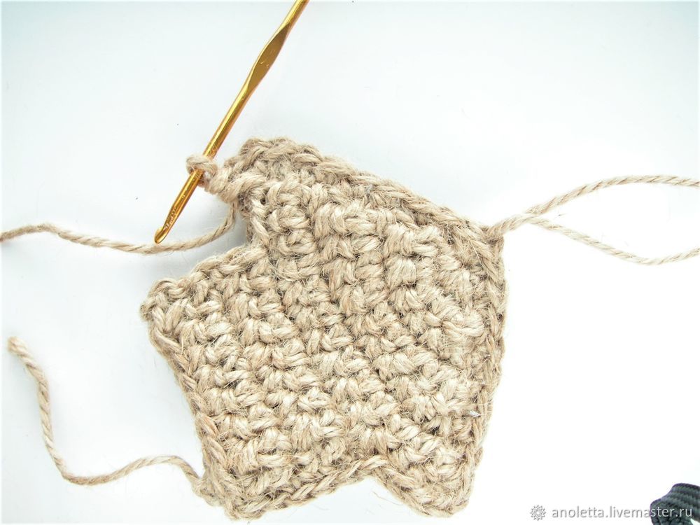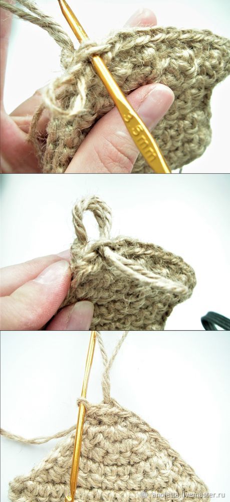 Дальше вяжем ровно. Чтобы петелька была у нас по центру, можно протянуть ее через второй стбн в макушке крыши.