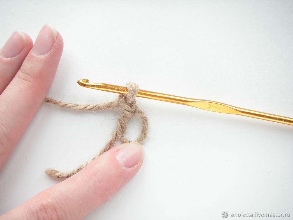Оставшийся короткий конец оставляем для формирования скользящей петли, которую будем использовать вместо воздушных петель для начала вязания. Итак, короткий конец нити мы складываем в кружок.