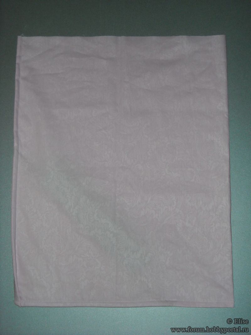 - Обрабатываем боковые срезы (по стороне длиной 50 см, где расположена клубничка) двойным швом - сначала стачиваем детали по лицевой стороне на расстоянии 0,3-0,5 см от срезов; затем выворачиваем изделие на изнаночную сторону, выправляем шов, и прокладываем машинную строчку на расстоянии 0,7-1см от края.
