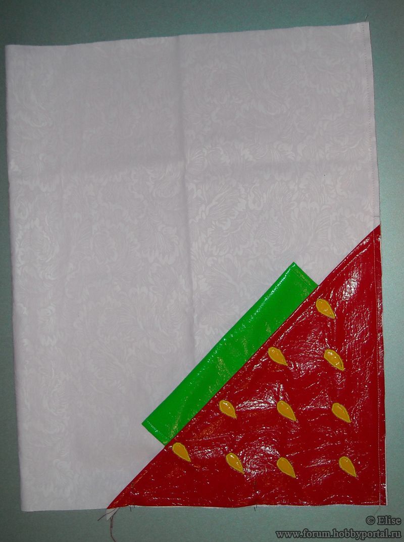 Я полагала, что лучше брать ткань красного цвета, но как показала практика в совместном пошиве сумочки, она смотрится эффектно практически в любом цвете. - 2 лоскута материала шириной 7 и длиной 26 см - для кулиски («хвостика» клубнички). У меня - лаке зеленого цвета.