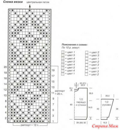 Набрать 48 п. пряжей 1 и вязать 5 см резинкой, добавив в последнем р. с равномерным распределением 37 п. = 85 п. Продолжить лиц. гладью. На высоте 15 см провязать между кром. п. 1х 80 р. узором в указанной последовательности смены цвета, узор распределив от середины. Для расширения рукавов одновременно прибавлять от резинки с обеих сторон в каждом 4 р, 26х по рисунку по 1 п. = 137 п. Провязать еще 2 р. цветом 2 и закрыть п. на высоте 43 см.