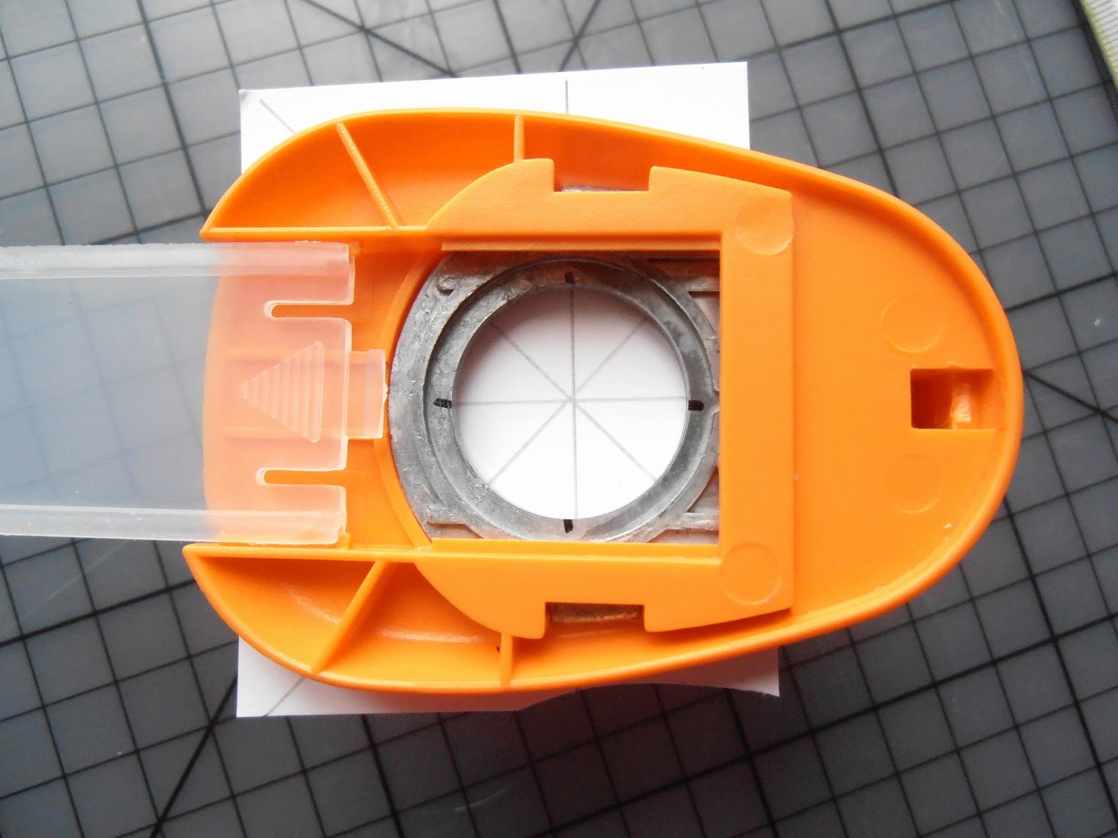 12. С помощью компостера, на режущие края которого я нанесла перманентным маркером отметки с интервалом в 90 градусов, вырезаем круг с намеченным центром.