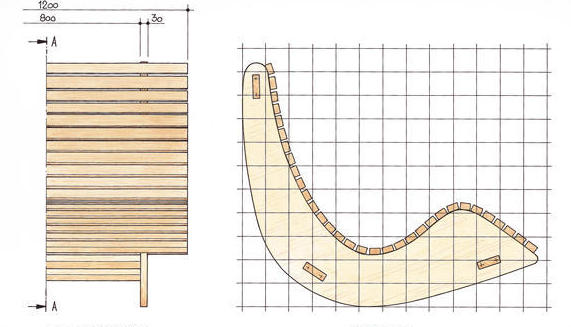 На бумаге или картоне нарисовать,расчертить эскиз будущей тетивы,опоры.Вырезать бумажную заготовку и начертить на фанере или мебельном щите.Фрезером выдолбить пазы под поперчены стяжки.