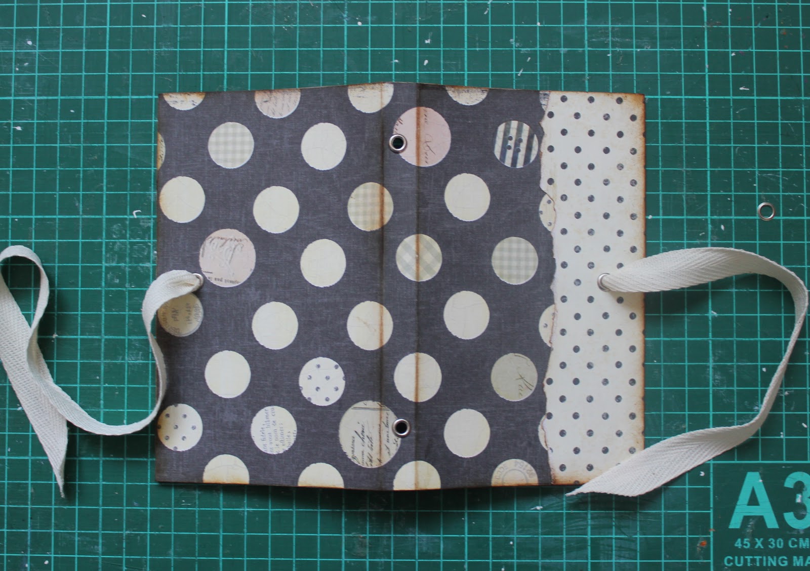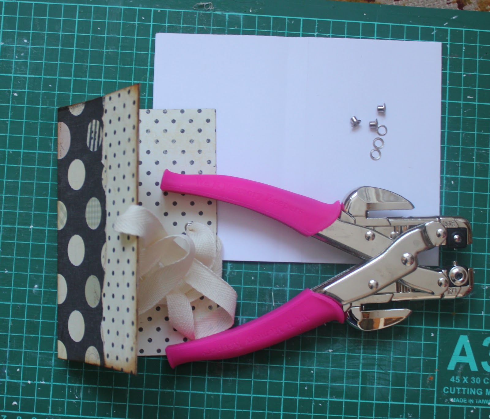 Пробивает "кроподайлом"отверстия на обложке и на страничках сверху и снизу на расстоянии 3хсм и совмещаем нашу обложку и странички друг с другом .