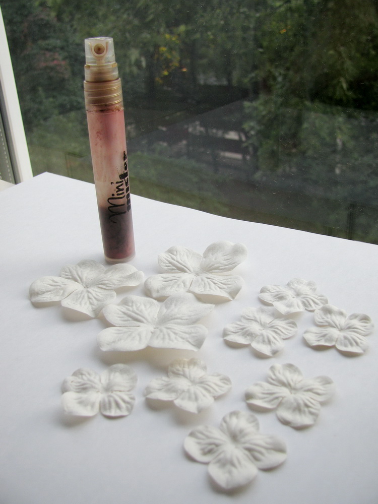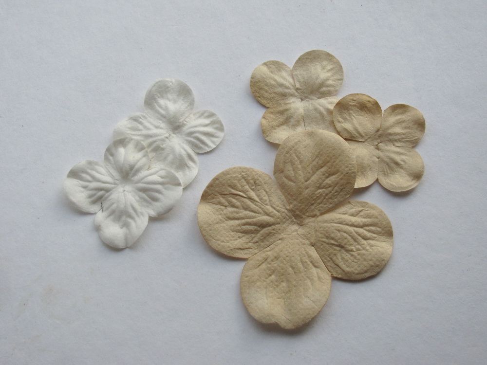 С такой проблемой я столкнулась при создании приглашений. Мне нужны были кремовые или кофейные цветы. На помощь пришли мини-мистер, раствор кофе и белые гортензии. Кстати, в последнее время я предпочитаю покупать именно белые цветы.