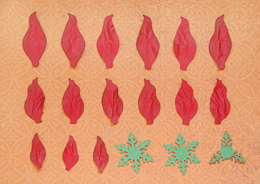 [показать]Punch out 6 largest petals, 6 of the next size down petals, and 3 of the second to smallest petals. Punch 3 snowflakes and remove every other point on one of the snowflakes. Also punch out 1 Starburst. (not shown). Ink the edges of the petals for depth, then mist them slightly and wrinkle the petals for texture. Let dry. Do not soak them or paper may tear.