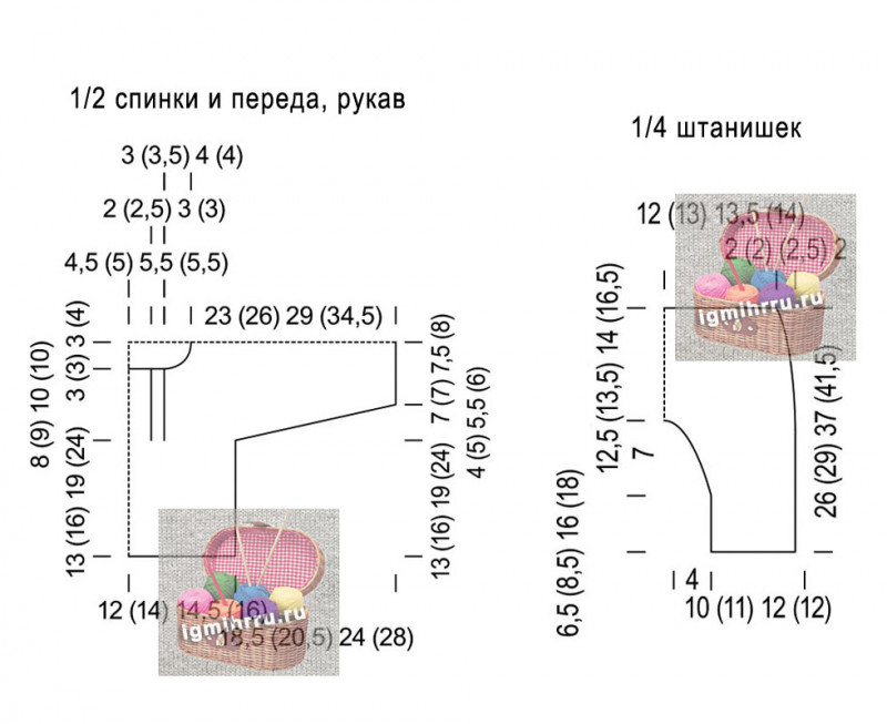 Спинка: для первой штанины на спицы № 4 набрать 22 (24) 26 (26) петель и вязать 6,5 (8,5) 16 (18) см лицевой гладью. Для шагового скоса прибавить с лицевой стороны в каждом следующем 6-м ряду и в следующем 4-м ряду 3 х 1 п., затем в каждом следующем 2-м ряду 2 х 1 п. и в каждом следующем ряду 3 х 1 п. = 30 (32) 34 (34) петли. Вязать 1 ряд, затем в следующем ряду через 13,5 (15,5) 23 (25) см от начального ряда отложить петли.