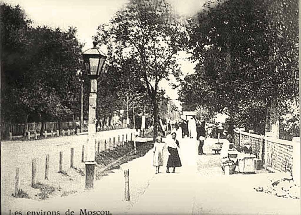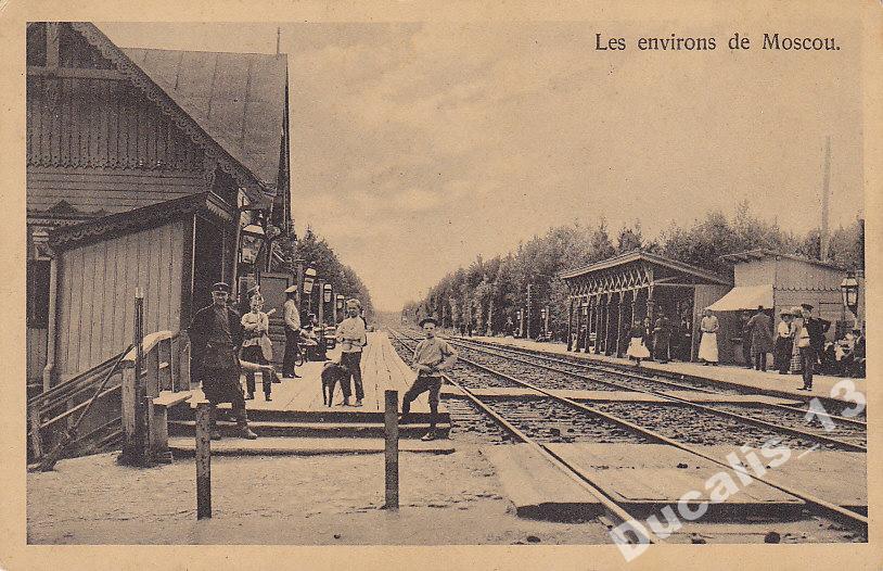 ...Задний фасад станции выходит на шоссе, которое идет через парк на протяжении трех верст к селу Пушкино. По сторонам шоссе на первом плане расположены лавки, булочные, аптека, почтовое отделение, телеграф, татерсаль; за ними парк с расчищенными дорожками, беседками, скамейками, а в глубине его дачи особняки...