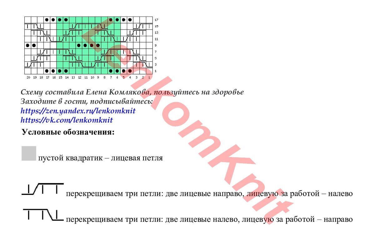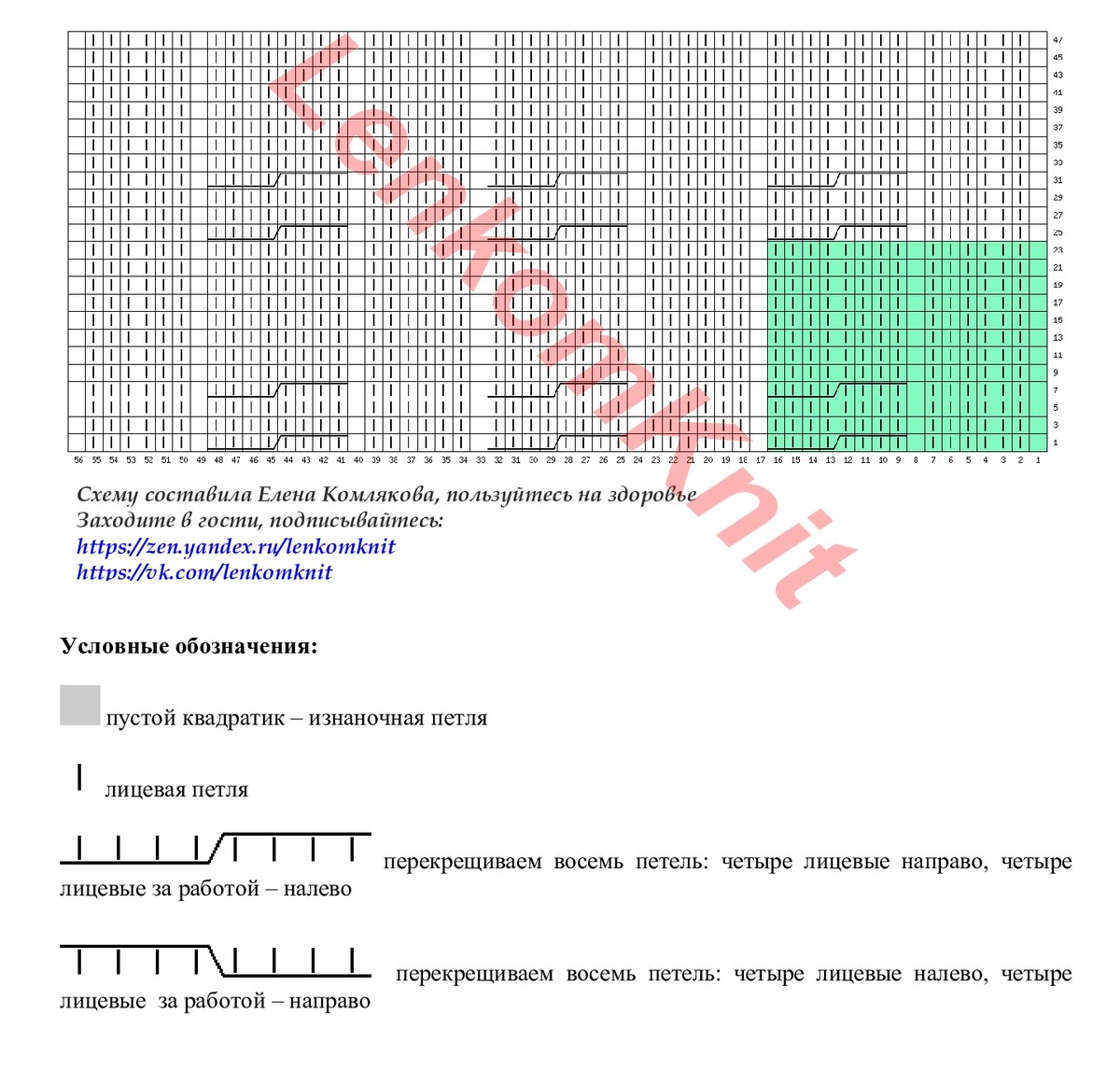 Я составила примерную схему узора для нечетных (лицевых) рядов. Зеленым цветом на схеме обозначен раппорт узора. Пустые клетки - это изнаночная гладь.
