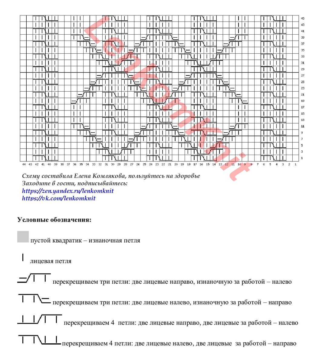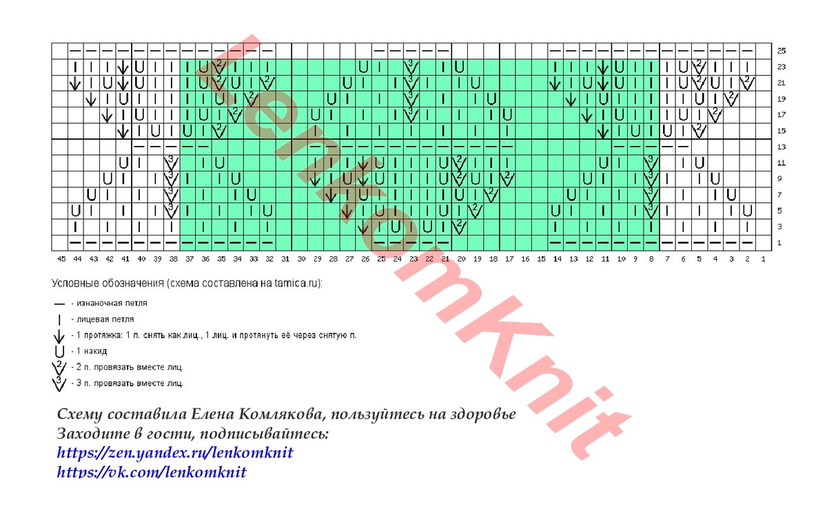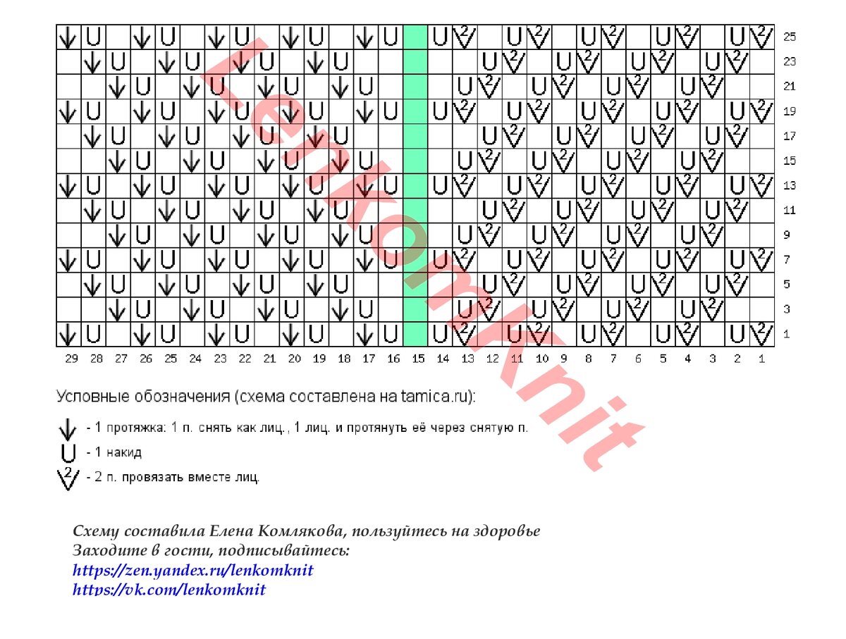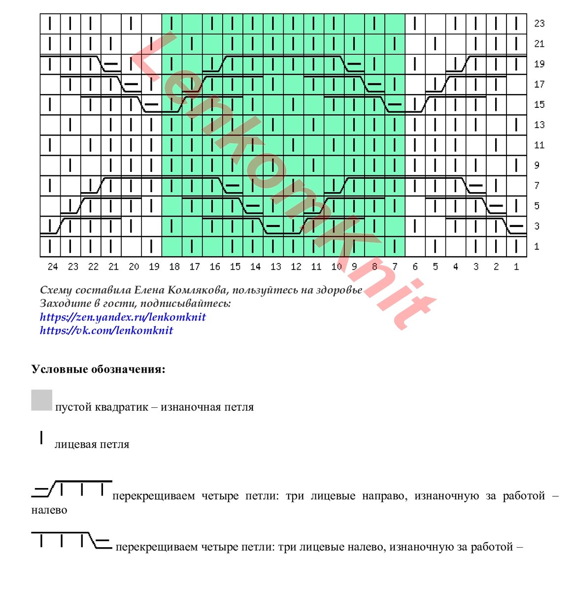 Схема узора для рукавов - на рисунке. Зеленым цветом отмечена центральная петля рукава.