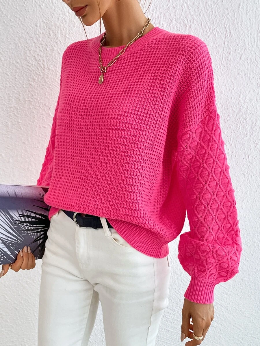 Шестой свитер связан из ярко-розовой пряжи. Перед и спинка связаны полупатентной резинкой. У свитера спущенное плечо и круглый ворот.