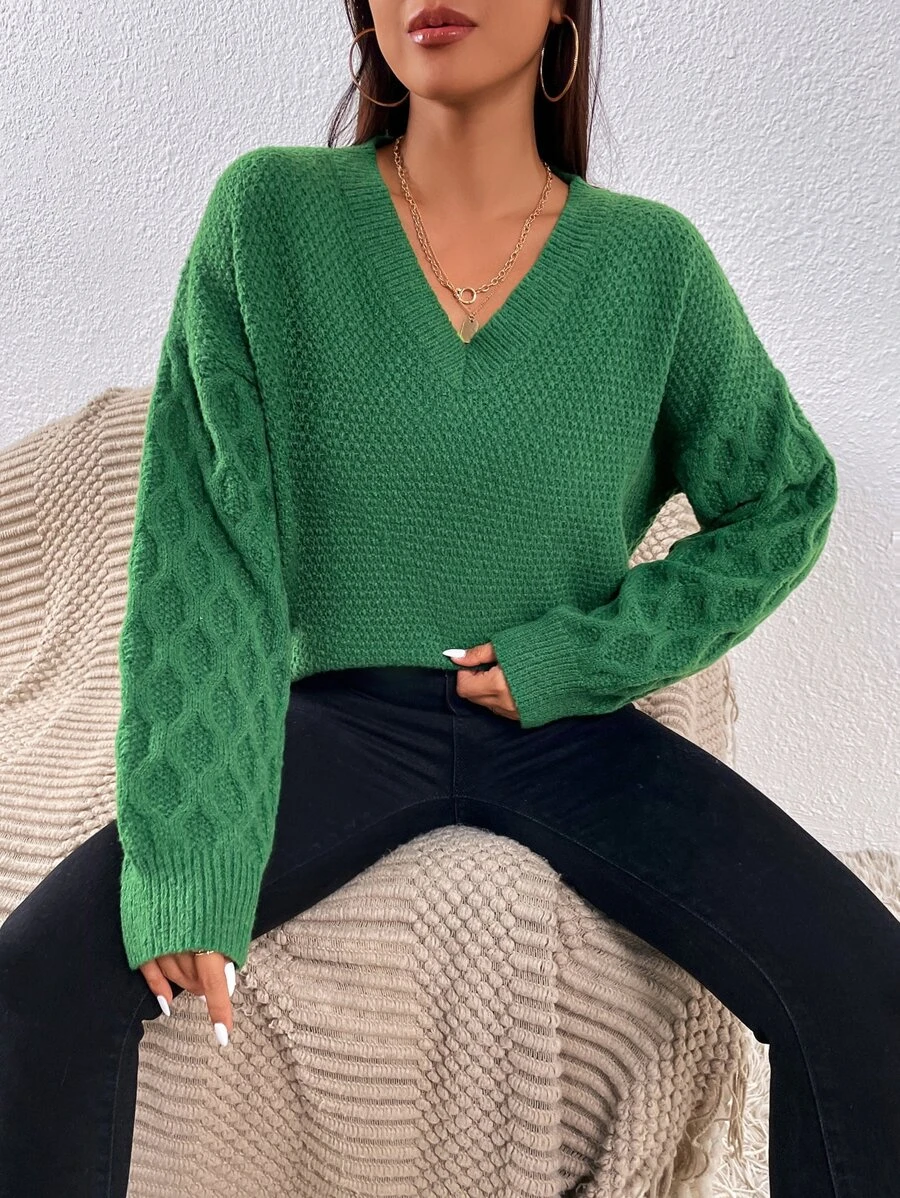 Четвертый свитер мне понравился красивым зеленым цветом. У него вырез в виде V. Спинка и перед связаны жемчужным узором (чередуются лицевая и изнаночная петли, они меняются местами через каждые два ряда (раппорт = две петли в ширину и два ряда в высоту).