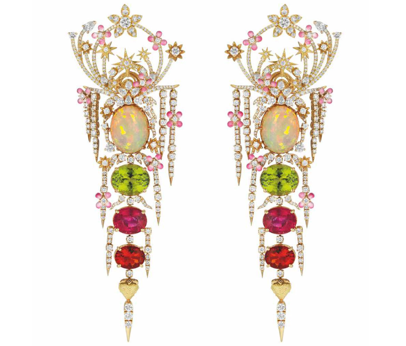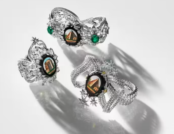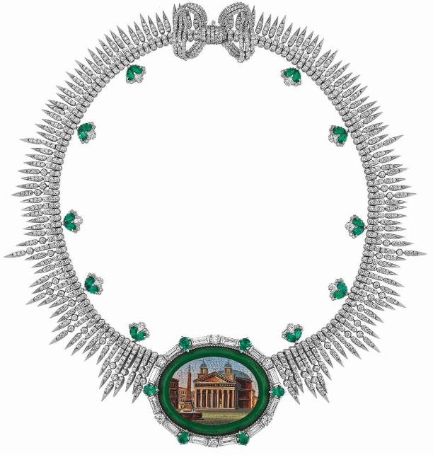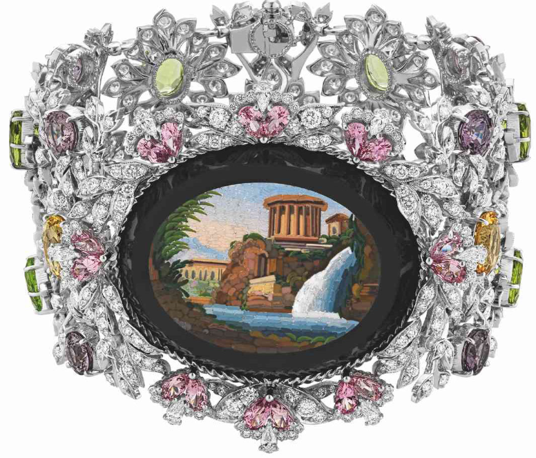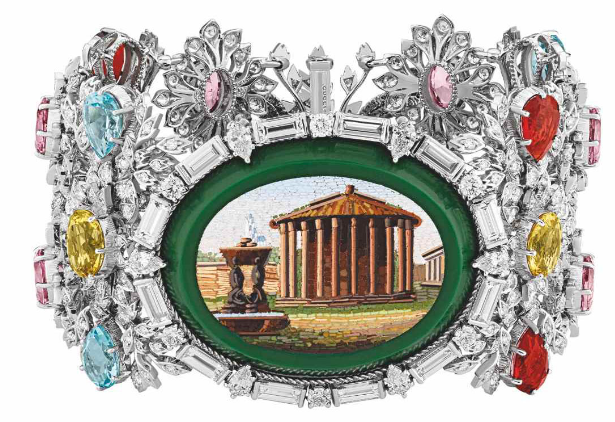 В этих невероятных увелирных украшениях Алессандро Микеле воспевает древнее великолепие сочетая микромозаики со сверкающим перидотом, желтым бериллом, красной и розовой шпинелью, голубым топазом, огненным опалом, розовым турмалином и разноцветными бриллиантами.