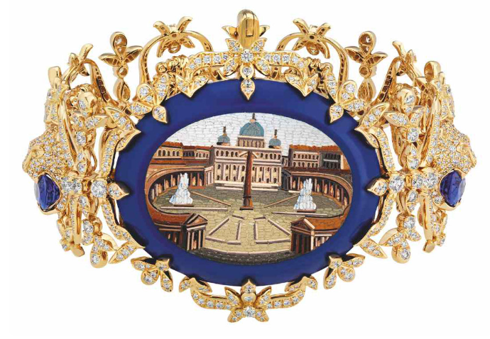 Алессандро Микеле в некоторые из этих украшений инкрустировал мозаику, созданную между 1850 и 1870 годами и изображающую типичные римские пейзажи — от Колизея и Пантеона до водопадов в Тиволи. Они гармонируют со сверкающими перидотами, желтыми бериллами, топазами, огненными опалами, розовыми турмалинами и бриллиантами. Получилось очень красиво!