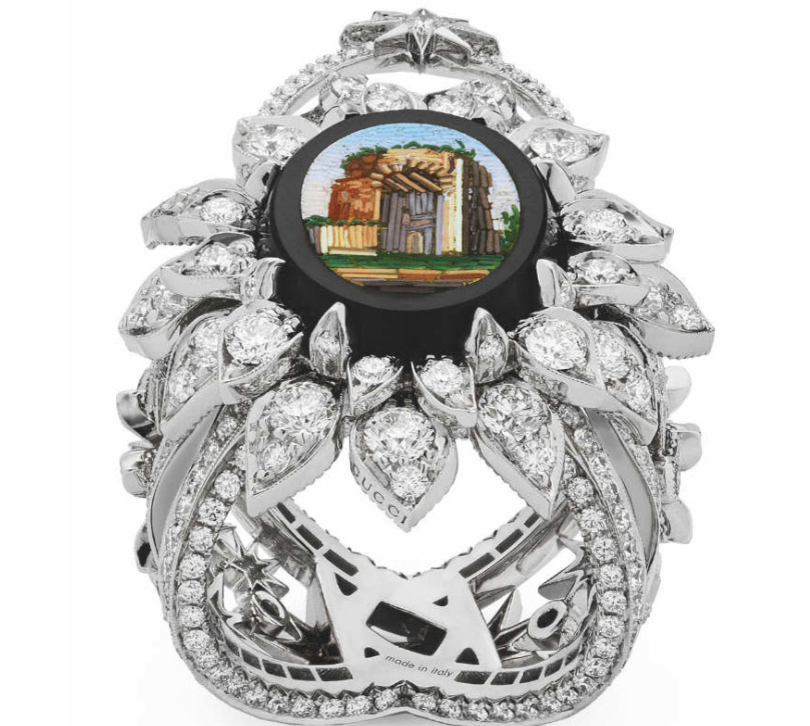 В этих украшениях, разделенных на пять тем, модый дом Гуччи показал ювелирную моду и соответствующую ей архитектурные эпохи. Эти украшения, созданные талантливыми мастерами, - застывшая во времени и пространстве память с романтическим настроением.