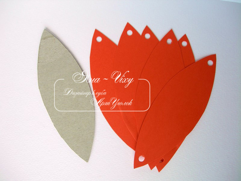 Шаг 1. Сделайте из плотного картона шаблон 14 см в длину и около 5-ти см в ширину в середине. По шаблону вырежьте 6 деталей из оранжевого кардстока. Дыроколом сделайте отверстия на концай лепестков.