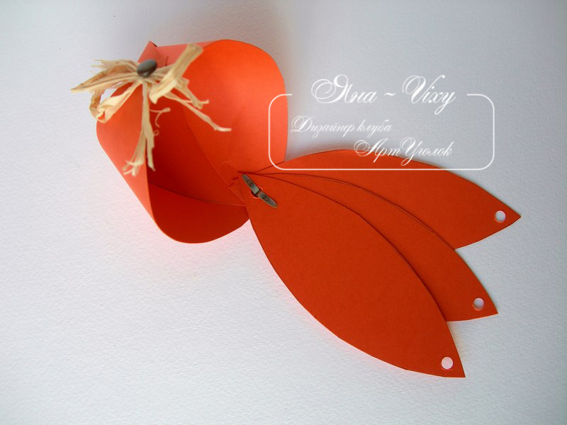 Шаг 3. Теперь самое сложное. Переверните веер ножками брадса вверх. Возьмите брадс с бантиком, согните полумесяцем крайний лепесток тыковки и вставьте брадс в отверстие. Затем надо нанизать на брадс следующий лепесток, третий, четвёртый. Теперь разогните ножки брадса, что бы лепестки не выскочили.