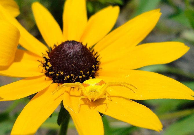 33. Яркий паучок на фоне желтого цветка в парке (Дорсет, Онтарио, Канада).