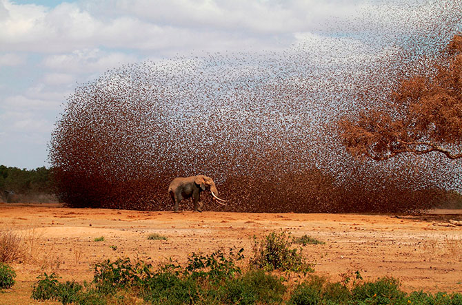 38. Пить хотят все: красноклювые ткачи и африканский слон у водопоя Национального парка Цаво, Кения.