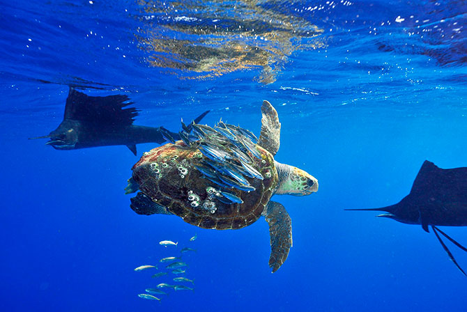 19. Рыбы прячутся за морскую черепаху от хищника – рыбы-парусника, которая является самой быстроплавающей рыбой в мире, развивающей скорость до 100 км/час.