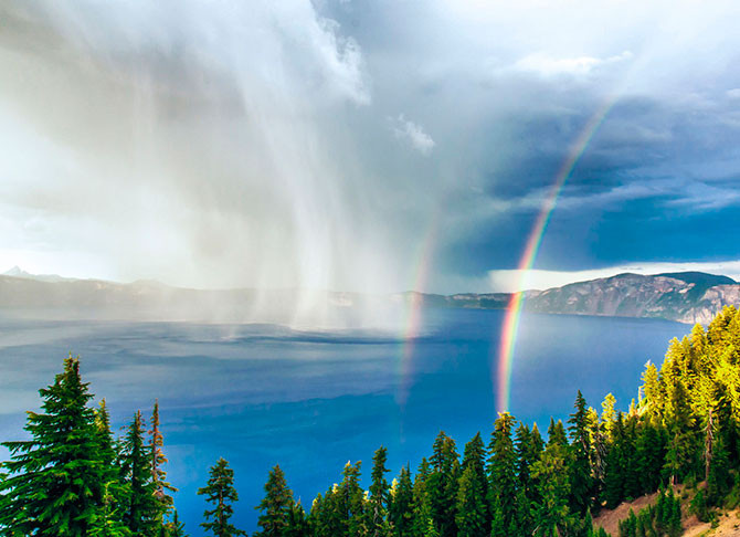 39. Вид на озеро Крейтер во время дождя (штат Орегон, США).