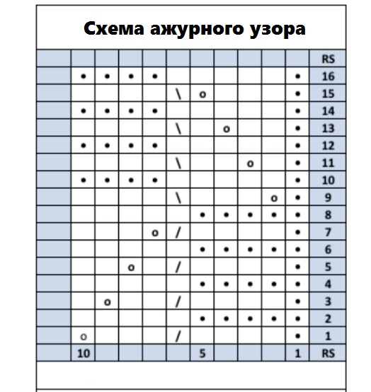 СХЕМА АЖУРНОГО УЗОРА (вяжется по кругу, все ряды лицевые, раппорт 10 п.)