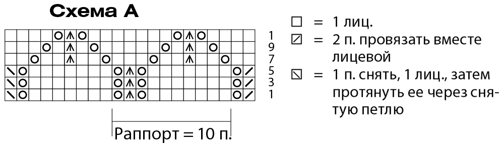 Вязать по схеме А. На схеме обозначены только лицевые ряды. В изнаночных рядах петли вязать по рисунку, нить проводить по лицевой стороне работы. В высоту повторять с 1-го по 12-й р.
