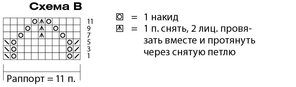 Вязать по схеме В. На схеме обозначены только лицевые ряды. В изнаночных рядах петли вязать по рисунку, нить проводить по лицевой стороне работы. Повторять с 1-го по 12-й р.