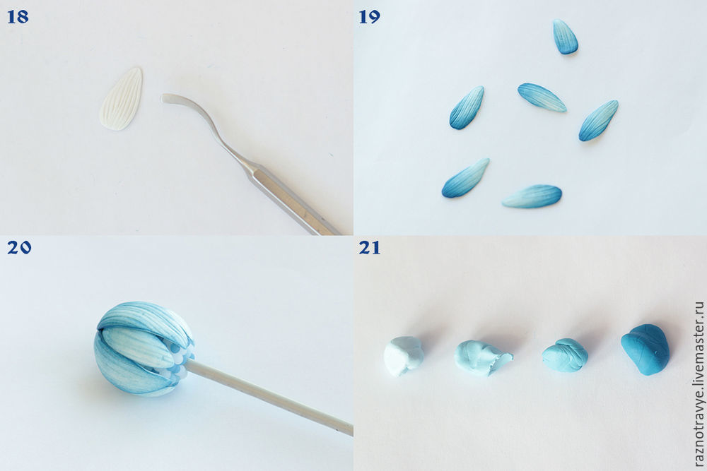 21. Приступим к следующим бусинам. Намешаем из белой и синей глины 4 оттенка голубого от светлого к самому темному.
