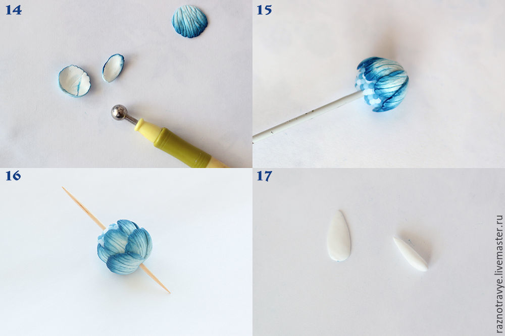 9. Делаем лепестки для центрального цветка. Катаем несколько шариков из обычной белой глины. Двух немного разных размеров. Делаем из них штук 8 плоской каплеобразной формы и штуки 4 круглой. Стеком или зубочисткой делаем им с верхней стороны зазубринки.
