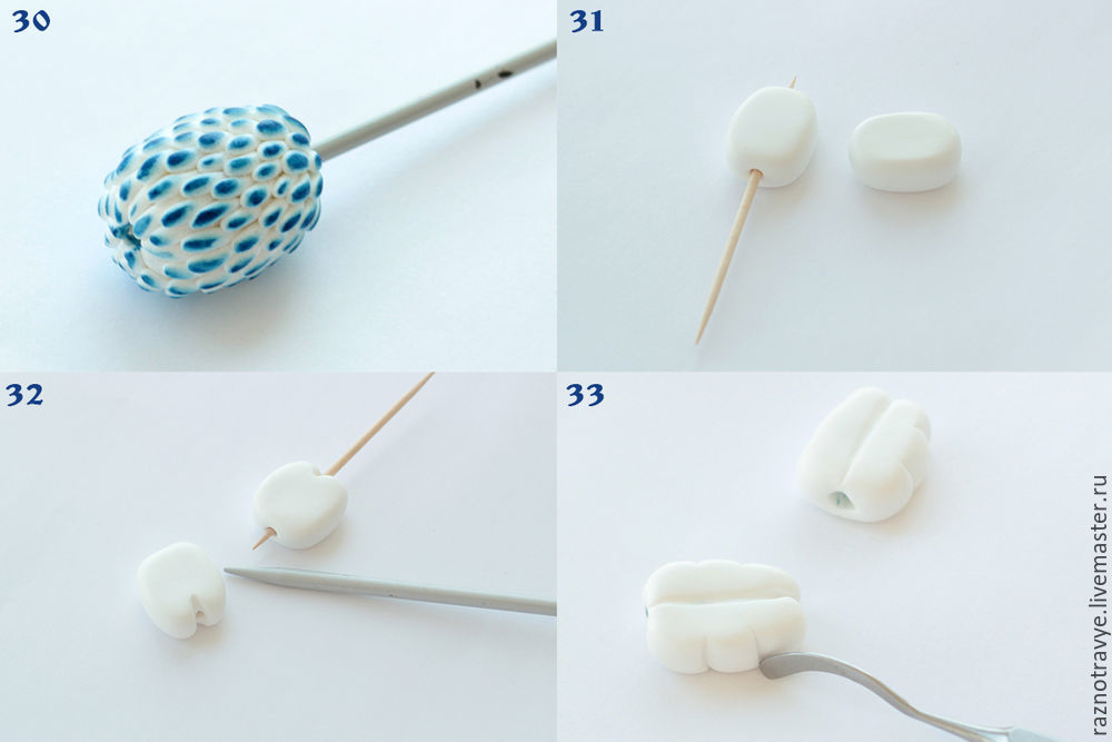 29. И снова катаем капельки из белой глины. Оставляем их объемными, не приплющиваем. Смазываем основу слегка жидкой пластикой. Обклеиваем по тому же принципу как и предыдущую, только клеим капельки наоборот вверх широкой частью. Вот так.