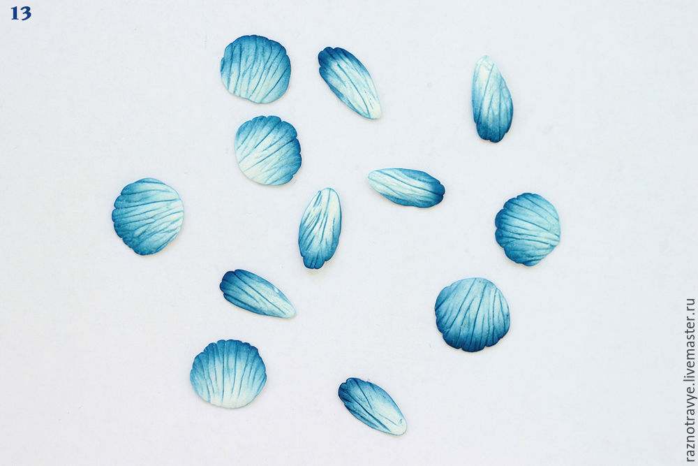 12. Тонируем лепестки. Сначала я сухой кистью замазала полностью лепестки голубой пастелью. Потом стерла ее влажной салфеткой, оставив только в углублениях. Потом прошлась темно-синей пастелью по краю лепестка, растушевывая к середине.