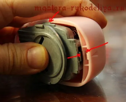 Ножничками отжимаете пластмассу вот в этих местах (стрелочки), снизу и в прорези