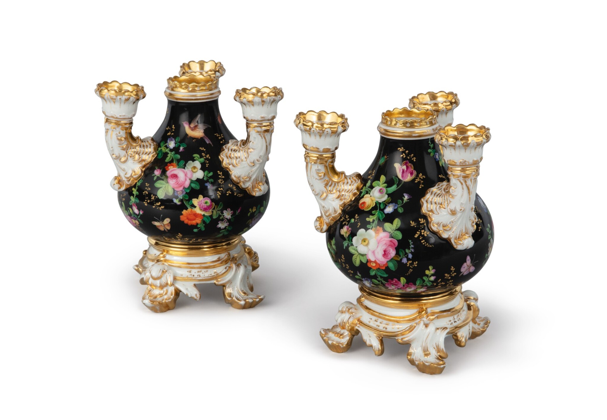 A PAIR OF PARIS (JACOB PETIT) FOUR-NOZZLE TULIP VASES, CIRCA 1840