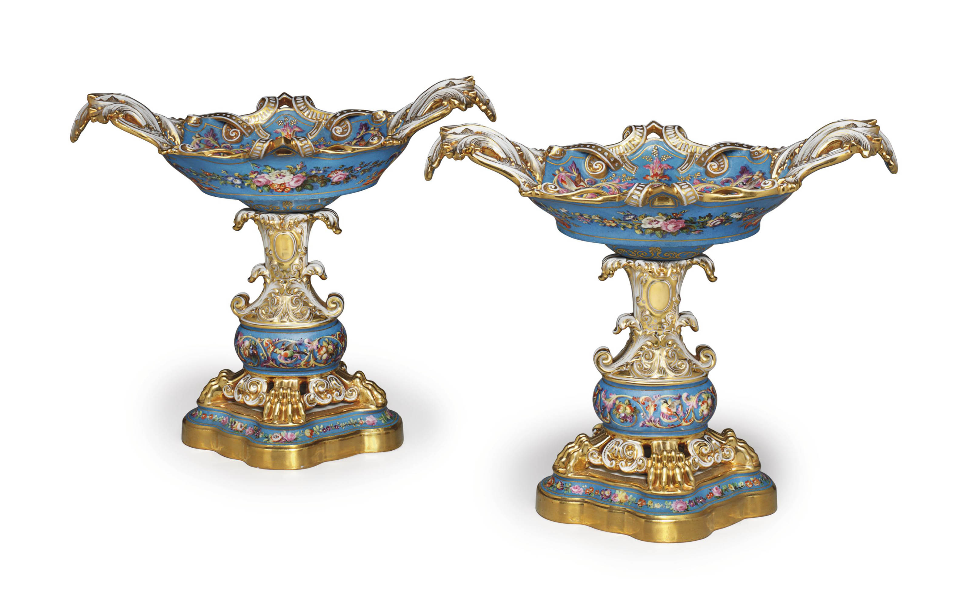 A PAIR OF JACOB PETIT PORCELAIN BLUE-GROUND TWO-HANDLED TAZZE ON FIXED STANDS