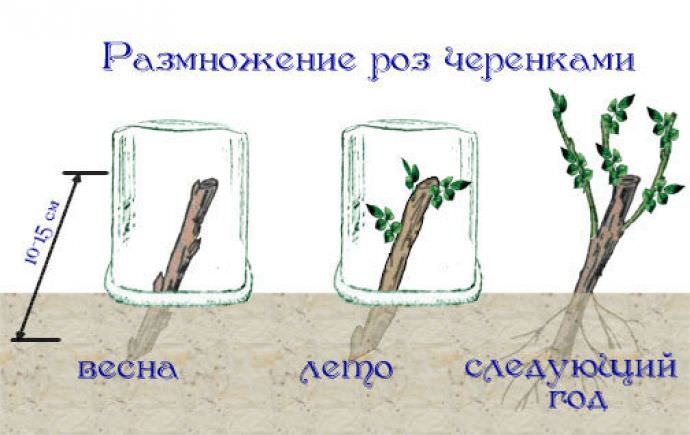 Укоренение черенков розы можно осуществлять непосредственно в саду. Предварительно следует подготовить питательный субстрат на основе промытого крупнозернистого песка и плодородного грунта. Подготовленные черенки розы следует прикапывать под углом в 45º. Посадочные лунки предварительно следует пролить крутым кипятком с добавлением марганцовокислого калия. Высаженные черенки необходимо прикрыть пластиковыми или стеклянными ёмкостями, что позволит добиться парникового эффекта.